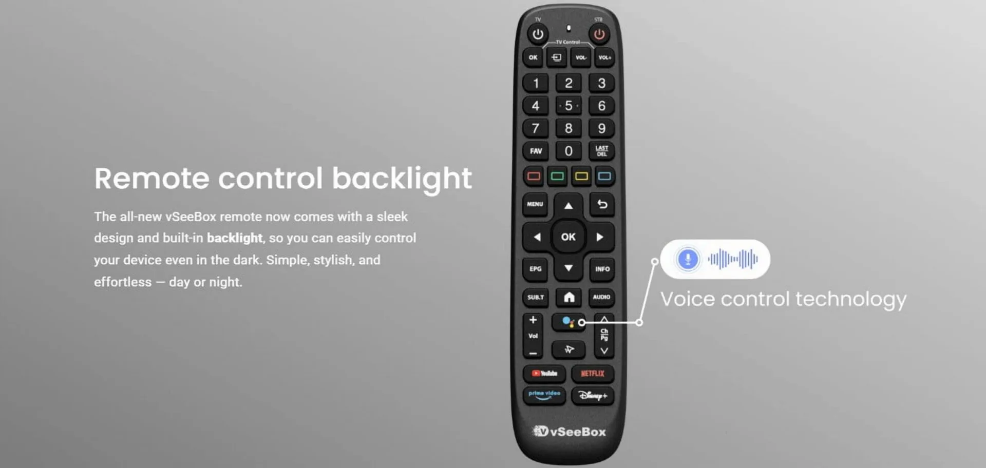 The all-new vSeeBox remote now comes with a sleek design and built-in backlight, so you can easily control your device even in the dark.